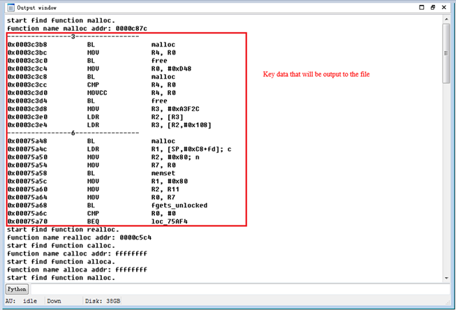 The filter function can filter the above two forms of code, and also contains some other instructions (omitted here) that can be used to judge the value in R0. To analyze the omission of the filter function, the script outputs the key data in the output data in the IDA output window to the file. The output of the IDA output window contains the complete data output, as shown in the following figure: