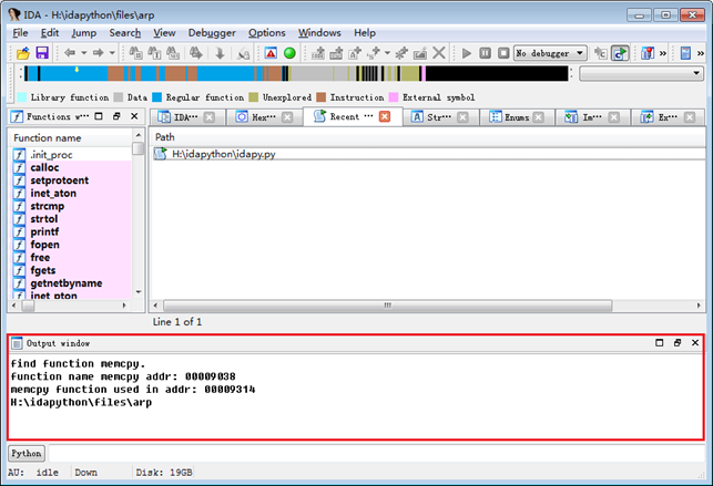 Under script file execution mode, you select the IDApython script to be executed by "File"->"Script file…" in the IDA menu. After selecting the IDApython script to be executed, a "Recent scripts" tab window will be added to the IDA interface. In the window page, the corresponding script file will be executed by double-clicking. The result of the script will be output to the output window at the bottom of the window. After the IDApython script is executed, the IDA window interface may be as follow: